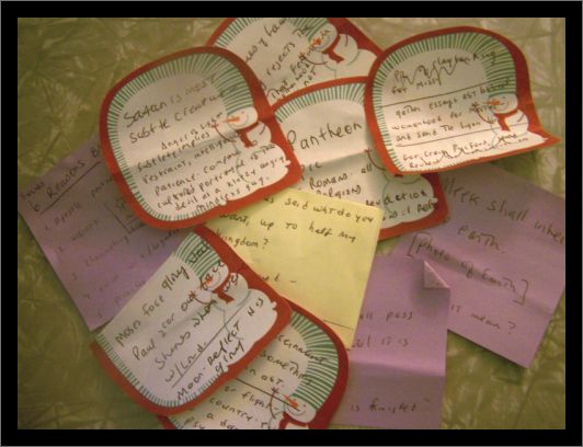When I studied the Bible before the Plan, I'd just pick a book and read it through. I stopped reading for the day when I felt full up and unable to absorb any more. Sometimes that occurred after half a chapter. Other times I read two or three chapters before I felt unable to spiritually absorb any more. Usually while reading, my mind raced with ideas and questions and I eagerly looked up parallel verses, the Greek words, or other verses the Spirit brought to mind. I have a small Post-it notes next to my table and I jotted down ideas and thoughts to pursue later. Here is the pile of Post-its I haven't yet pursued, written before I started the plan: