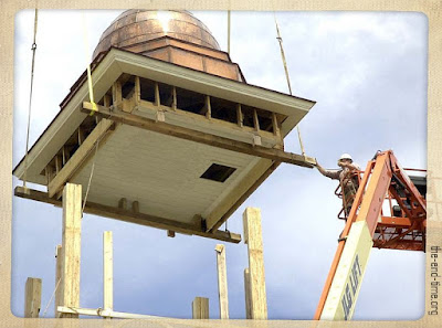 St. Mark's, which has no website, has never needed to tell the 22,000 people in Wadsworth where it was because, Likens says, "everyone in town knows this is the church with the bell tower."Caption photo below: This New England Historic church's cupola was removed for repair and returned atop the church. It was an lengthy, expensive, and delicate process.