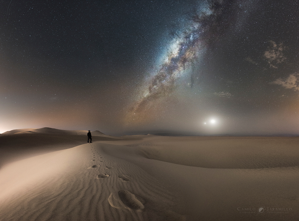 Explanation: A beautiful conjunction of Venus and Moon, human, sand, and Milky Way is depicted in this night skyscape from planet Earth. The scene is a panorama of 6 photos taken in a moment near the end of a journey. In the foreground, footsteps along the wind-rippled dunes are close to the Huacachina oasis in the southwestern desert of Peru. An engaging perspective on the world at night, the stunning final image was also chosen as a winner in The World at Night's 2017 International Earth and Sky Photo Contest.